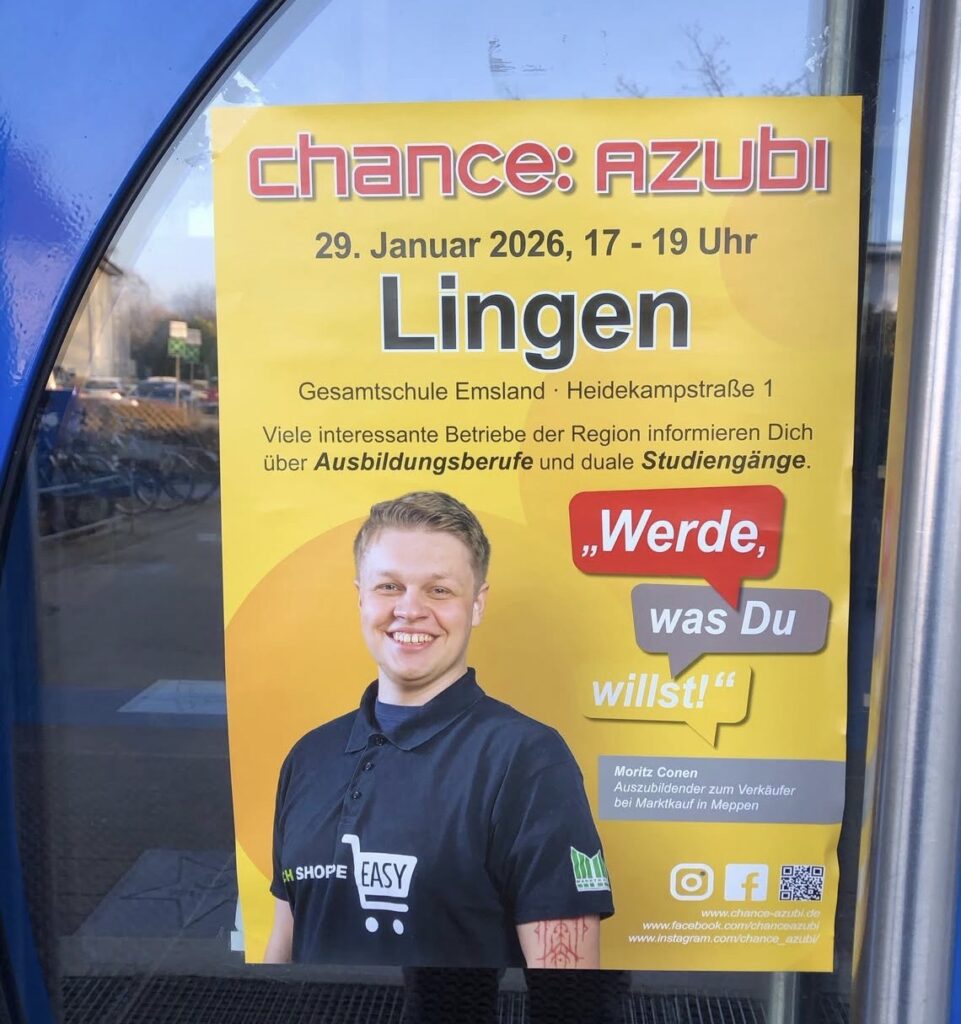 Am Donnerstag, 29. Januar 2026, findet von 17:00 bis 19:00 Uhr an der Gesamtschule Emsland in Lingen die Ausbildungsmesse „Chance: Azubi“ statt.